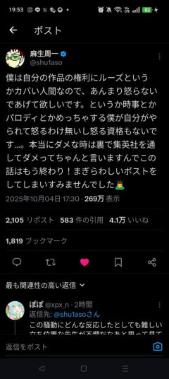 1: 名無しのアニゲーさん 2025/10/04(土) 19:54:03.132 ID:C2Mc6FawP 終わりだよこのSNSの民度 2: 名無しのアニゲーさん 2025/10/04(土) 19:55:48.540 ID:C2Mc6FawP ちなみに何があったかって言うとこれ勝手に斉木楠雄の商用利用したやつをネタとして投稿→利用したやつがリプする→作者の皮肉に気づいてないと炎上、削除…