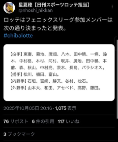 659: 名無しさん 2025/10/05(日) 20:19:41.192 ID:zRjyqhzu3 フェニックス参加メンバー ロッテはフェニックスリーグ参加メンバーは次の通り決まったと発表。#chibalotte pic.twitter.com/FILjFakdn0— 星夏穂【日刊スポーツロッテ担当】 (@nhoshi_nikkan) October 5, 2025…