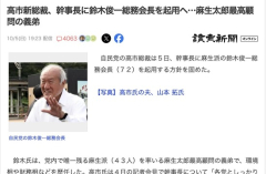 1 : 高市新総裁、幹事長に鈴木俊一総務会長を起用へ…麻生太郎最高顧問の義弟(読売新聞オンライン) - Yahoo!ニュース 自民党の高市総裁は5日、幹事長に麻生派の鈴木俊一総務会長(72)を起用する方針を固めた。全文はソースで 2 : 麻生氏の副総裁起用案浮上(共同通信) - Yahoo!ニュース 自民党の役員人事を巡り、麻生派会長の麻生太郎元首相を副総裁に充てる人事案が浮上した。関係者が5日明らかにした。全文はソースで 3 : 第二次麻生内閣やろこれ 4 : 麻生太郎の院政 操り人形高市…