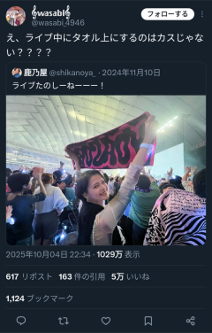 1: 2025/10/06(月) 00:03:16.24 え、ライブ中にタオル上にするのはカスじゃない???? — 𝄞𝕨𝕒𝕤𝕒𝕓𝕚𝄞 (@wasabi_4946) October 4, 2025 ※関連記事 【画像】この漫画の「ダメ人間」と付き合っている彼女の話、少し怖くて草wwwww…