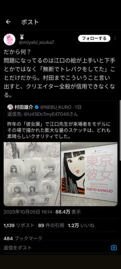 1: 2025/10/05(日) 23:49:20.401 トレパク疑惑の江口を擁護してしまった結果、炎上してしまった模様昨年の「彼女展」で江口先生が来場者をモデルにその場で描かれた膨大な量のスケッチは、どれも素晴らしいクオリティでした。 pic.twitter.com/X5gh1rvgh2— 村田雄介 (@NEBU_KURO) October 4, 2025 ※関連記事 【画像】漫画家の江口寿史、トレパクが続々発覚し完全に終わる。古塔つみ二世になりそう…