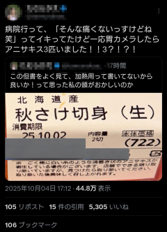 女さん「『秋鮭(生)』って書いてあるから生で食べれるってことだよね!」→アニサキス感染