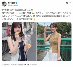 【デジタル限定】有村藍里写真集「Brand New Day」 週プレ PHOTO BOOK有村藍里週刊プレイボーイ2019-05-27有村藍里 あいりのまま。 100ページ超え豪華版 withTALENTデジタル写真集講談社2024-11-201: 以下、名無しで筋肉速報がお送りします 2025/10/06(月) 07:26:17.32 ID:oE3MK6is9 有村藍里 「1年かけて約10kg減量しました」圧巻ビフォーアフター公開 称賛の声集まる [ 2025年10月5日 22:10 ] スポニチ 有村藍里のX(@arimuraairi)から 女優の有村藍里が5日、自身のXを更新。ダイエットに成功したことを報告した。 有村は「1年かけて約10kg減量しました 食生活を見直し、ここ数ヶ月はジムでのトレーニングなどを取り入れてました」と明かし、ビフォーアフターの写真をアップ。 「どっちもいいと思うけど、個人的には減量後の方が体調を崩しにくくなったのと、身体が動きやすい」とつづった。 (※以下略、全文は引用元サイトをご覧ください。)…