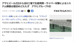 1 : サイバー攻撃によるシステム障害が続いている「アサヒグループホールディングス」は6日、アサヒビールの全6工場で2日から生産を再開していたと明らかにしました。 アサヒビールでは主力商品については、1日には、試験的に手作業での受注を始め、それに応じて生産をしていました。 システム障害は依然として復旧のめどが立っていないということです。 5 : クラウドに移行するとこういう時なんも対処できんよな 6 : ランサムウェアにやられたんでしょ? しばらく復旧無理だろ…