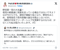 1 名前:名無しさん@涙目です。[] 投稿日:2025/10/04(土) 22:08:34.24 ID:y2/4oWdM0 東京脱出ゆりな🐮牛乳パック @YUUNA_BURUBESUM アンフェ弱者男性たちがここぞとばかりに「女性首相が誕生したぞ!ガラス天井とかない!」とか言ってるけど、 高市早苗って【名誉男性】だろ。 反フェミ思想、自分は旧姓使っといて選択制夫婦別姓反対。 おっさん議員に歯向かわない従順な女。女の敵です。 6 名前:名無しさん@涙目です。[] 投稿日:2025/10/04(土) 22:10:12.34 ID:hgwxY/G50 ああ酒がうまい 8 名前:名無しさん@涙目です。[] 投稿日:2025/10/04(土) 22:11:43.50 ID:C/7n3rqH0 似非フェミの断末魔が心地よいわwww 59 名前:名無しさん@涙目です。[] 投稿日:2025/10/04(土) 22:41:49.58 ID:0fXL5MGf0 とんでもない差別だわ 50 名前:名無しさん@涙目です。[] 投稿日:2025/10/04(土) 22:34:56.95 ID:3F1nJkeu0 自らに都合が悪ければ出鱈目な内容でも何でも言いだす、実にクソフェミらしい言い草だな 15 名前:名無しさん@涙目です。[] 投稿日:2025/10/04(土) 22:14:20.84 ID:E/df2bYK0 フェミにとっちゃサッチャーとかも敵なんかね 20 名前:名無しさん@涙目です。[sage] 投稿日:2025/10/04(土) 22:16:59.88 ID:M77ubBVH0 >おっさん議員に歯向かわない従順な女。女の敵です。 すげー、どこの別空間で生きているんだろう 26 名前:名無しさん@涙目です。[] 投稿日:2025/10/04(土) 22:19:47.74 ID:D9GU6EgO0 >>20 従順w 201 名前:名無しさん@涙目です。[sage] 投稿日:2025/10/05(日) 04:53:21.41 ID:MkkvVsk80 >>20 自分で作った物語しか見てないんだろう 40 名前:名無しさん@涙目です。[] 投稿日:2025/10/04(土) 22:28:14.95 ID:RDYbkEgy0 >>20 野田に媚びてる福島さんは女の敵になってしまうなw 5 名前:名無しさん@涙目です。[sage] 投稿日:2025/10/04(土) 22:09:21.37 ID:iFb+rvna0 むしろ媚びてないからなかなか総理になれなかったのに 7 名前:名無しさん@涙目です。[sage] 投稿日:2025/10/04(土) 22:10:25.61 ID:iFb+rvna0 麻生にも飲みに行けとたしなめられるほど議員同士の会食に行かなかったのが高市 122 名前:名無しさん@涙目です。[sage] 投稿日:2025/10/04(土) 23:44:20.02 ID:NH+iNjtj0 >>7 飲み行く時間あるなら勉強しますわってとにかく努力してきた人なのに誰に媚びてるって言うんだろうな 124 名前:名無しさん@涙目です。[] 投稿日:2025/10/04(土) 23:46:08.28 ID:E1b+PBao0 >>122 ここ一年は飲み会にも顔を出したという ソースが産経ニュースにあったぞ 彼女も努力したんだろう 139 名前:名無しさん@涙目です。[sage] 投稿日:2025/10/05(日) 00:04:01.67 ID:VrtjKtcy0 >>124 総裁選見据えてのコミュニケーションだろうな それで実際に結果残したんだから大したもんだよ本当に 68 名前:名無しさん@涙目です。[] 投稿日:2025/10/04(土) 22:46:17.36 ID:vrfft8d50 あれ?史上初の女性総裁だぞ?フェミさん喜ばないの? 66 名前:名無しさん@涙目です。[] 投稿日:2025/10/04(土) 22:45:47.72 ID:bS0e/5JU0 「史上初の女性総理を何でフェミは喜ばないんだ!」 ☝ 知恵遅れバカウヨが無い知恵絞って必死に考えたイヤミがこれ🤣🤣🤣 219 名前:名無しさん@涙目です。[] 投稿日:2025/10/05(日) 06:57:19.33 ID:8blGQEqZ0 >>66 お前何で発狂してんの?w 203 名前:名無しさん@涙目です。[sage] 投稿日:2025/10/05(日) 04:54:28.29 ID:MkkvVsk80 >>66 お前ら「負け側」に嫌味なんて言う必要ないんだぞ? 71 名前:名無しさん@涙目です。[] 投稿日:2025/10/04(土) 22:47:25.11 ID:eBftK+bA0 >>66 知恵遅れのパヨヨーンが必死に考えた返しがこれww(^^) 91 名前:名無しさん@涙目です。[sage] 投稿日:2025/10/04(土) 23:04:42.48 ID:RE0VccWI0 >>71 必死に考えた結果が鸚鵡返しは惨めやな 165 名前:名無しさん@涙目です。[sage] 投稿日:2025/10/05(日) 01:15:00.35 ID:fRMSCopW0 保守かリベラルか置いといて、女性には嫌われている。 そこはずっと謎。 誰か男に解るように分析して欲しい。 173 名前:名無しさん@涙目です。[] 投稿日:2025/10/05(日) 01:22:17.95 ID:GHCrt5VV0 >>165 主語無いけど高市の事? 別に特段女性に嫌われてるとか無いでしょ 弱者コスプレしてる奴がバレるの恐れて叩いてるだけで 175 名前:名無しさん@涙目です。[] 投稿日:2025/10/05(日) 01:23:31.84 ID:+z7qUjFl0 >>165 安倍を自称リベラルの上層部が嫌いだから 全体主義的な共産党全員が嫌い で、その後継を名乗る高市に敵意を向けている 181 名前:名無しさん@涙目です。[] 投稿日:2025/10/05(日) 01:54:04.08 ID:ED5ebAw00 >>165 女性ってのをざっくりと切りすぎ 声がでかい活動家の女性に嫌われてる 活動家でない女性は男女フラットに見ているか男性政治家の方を支持する傾向がある 186 名前:名無しさん@涙目です。[] 投稿日:2025/10/05(日) 02:41:02.95 ID:3ouqRgTP0 つじもと清美「祝意をお伝えします。」 ↓ 297 名前:名無しさん@涙目です。[] 投稿日:2025/10/05(日) 20:41:56.69 ID:IOkRR6us0 >>186 ちなみに1年前 ↓ 306 名前:名無しさん@涙目です。[] 投稿日:2025/10/06(月) 09:24:48.85 ID:25oV+AWT0 >>297 れいわ新選組に支持される自民党の石破茂 凄いなw 81 名前:名無しさん@涙目です。[] 投稿日:2025/10/04(土) 22:55:47.12 ID:AqO+KnxI0 >>1 こいつらって女性差別が大好きだよな 92 名前:名無しさん@涙目です。[] 投稿日:2025/10/04(土) 23:05:59.11 ID:CeUxZBr90 >>81 安倍さんは戦後レジームを打破するとは言ったが 