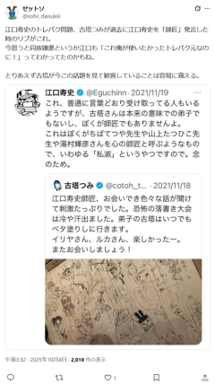 1: 2025/10/07(火) 10:31:30.42 これ、普通に言葉どおり受け取ってる人もいるようですが、古塔さんは本来の意味での弟子でもないし、ぼくが師匠でもありませんよ。これはぼくがちばてつや先生や山上たつひこ先生や湯村輝彦さんを心の師匠と呼ぶようなもので、いわゆる「私淑」というやつですので。念のため。 — 江口寿史 (@Eguchinn) November 19, 2021 ※関連記事 【速報】江口寿史を擁護してた中村佑介、度重なるトレパク発覚にブチ切れ、見放す「洗いざらい白状してきちんと謝罪しろ」wwwwwwww…