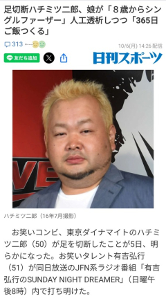 1 名前:名無しさん@おーぷん[] 投稿日:25/10/07(火) 15:31:29 ID:uHbc 糖尿病は怖いっすね…… ハチミツは21年1月のコロナ禍で8日間の意識不明に。それ以降、人工透析を開始。23年3月には母親をドナーとした腎移植手術を受けたものの失敗に終わった。同年8月、左大腿(だいたい)会陰部筋肉内膿瘍(のうよう)及び敗血症性ショックを公表。 足切断ハチミツ二郎、娘が「8歳からシングルファーザー」人工透析しつつ「365日ご飯つくる」 2 名前:名無しさん@おーぷん[] 投稿日:25/10/07(火) 15:32:13 ID:uHbc…