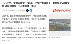 1 : 2日午後、富山市の商業施設駐車場で、78歳の女性が運転する車が、歩行者や他の車に衝突し、歩いていた68歳の男性など2人が重軽傷を負いました。 富山西警察署によりますと、2日午後3時50分ころ、富山市北二ツ屋地内の商業施設駐車場で、78歳の女性が運転する軽乗用車が、駐車しようとバックした際に後方の車に衝突、その後前進して歩いていた男性や、別の車にも衝突しました。 この事故で、駐車場を歩いていてはねられた68歳の男性が病院に救急搬送され、頭がい骨骨折の重傷です。 また、バックした際に衝突された車に乗っていた72歳の男性も軽傷を負いました。 8 : 踏み間違いからのパニック暴走 このパニック暴走が殺意高くて危険 基本アクセル全開だから 9 : 全方位に喧嘩を売っていくスタイル…