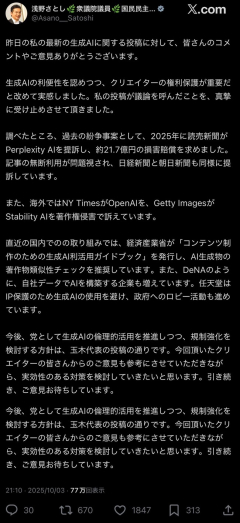 国民民主党・浅野哲(43)「任天堂は生成AIに関して日本政府に圧力かけてる」任天堂「そんなの知らん」