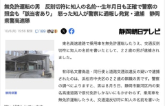 1 : 東名高速道路で乗用車を無免許運転したうえ、交通反則切符に知人の名前を書いたとして、22歳の男が逮捕されました。 有印私文書偽造・同行使と道路交通法違反の疑いで逮捕されたのは、浜松市中央区の22歳の無職の男です。警察の調べによりますと、男は8月5日、静岡市駿河区内の東名高速道路で原付免許しかないにもかかわらず、乗用車を無免許運転したうえ、交通違反切符に知人の名前を書いた疑いが持たれています。 警察によりますと、男が追い越し違反をしたため、警察官が車を止めて事情を聞くと、「免許を忘れた」と話したため、「免許不携帯」の違反切符を切りました。その際、男は知人の名前で署名、警察官は免許の有無を照会しましたが、知人の名前や生年月日が正しく記載されていたため、「該当者あり」と返答され、偽名に気付きませんでした。 ところがこの件で男と知人がトラブルとなり、知人が警察に通報、男の逮捕に至りました。警察の調べに対して、男は容疑を認めている、ということです。 4 : 超絶馬鹿 5 : 当たり前体操…