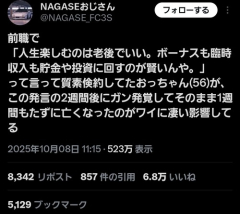 1: 2025/10/09(木) 00:36:52.03 前職で「人生楽しむのは老後でいい。ボーナスも臨時収入も貯金や投資に回すのが賢いんや。」って言って質素倹約してたおっちゃん(56)が、この発言の2週間後にガン発覚してそのまま1週間もたずに亡くなったのがワイに凄い影響してる— NAGASEおじさん (@NAGASE_FC3S) October 8, 2025 ※関連記事 【画像】この漫画の「ダメ人間」と付き合っている彼女の話、少し怖くて草wwwww…
