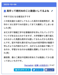 1 : 以下、?ちゃんねるからVIPがお送りします :2025/10/08(水) 09:04:13.047 ID:KzC/9aD50.net2 : 以下、?ちゃんねるからVIPがお送りします :2025/10/08(水) 09:04:32.082 ID:KzC/9aD50.net今年で33になる婚活女子ですこの前友達から紹介してもらった高卒の弱者男性が、高卒のくせに初手でAIの話をしてきて大爆笑してしまいました(笑)まだ大学で情報工学や計算機科学を学んでたバックグラウンドがあるならわかりますが、大学受験すら乗り越えられなかった馬鹿な高卒がAI語ってるもんだから失笑もんです。話す内容も案の定YouTubeの低学歴向け動画で学んだような内容のもので、AIがどんな仕組みで動いてるのか、学習させるのかは微塵も理解してなさそうでした(笑)最低限、最小二乗法や回帰分析あたりは勉強してから語ってほしいものです。3 : 以下、?ちゃんねるからVIPがお送りします :2025/10/08(水) 09:05:07.509 ID:KzC/9aD50.net弱男どーすんのこれ転載元スレッド:…