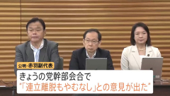 転載元: それでも動く名無し 2025/10/09(木) 16:52:32.05 ID:hkiF6PyD0 公明幹部会合「連立離脱もやむなし」 公明党の赤羽副代表はきょう午前に開かれた党の幹部会合で、「連立離脱もやむなし」との意見が出たことをあきらかにしました。 公明党 赤羽一嘉 副代表 「(連立)解消すべきだっていうか、そうなってもやむなしというか。『政治とカネ』の問題が全然クリアにならなかったら、やっぱそれはやむなしではないか」 ※ 2: それでも動く名無し 2025/10/09(木) 16:57:17.60 ID:a1a5d2Ja0 企業団体献金だけは高市は飲めないと対立してるらしい 裏金辞める全く無いやん自民党…