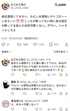 1: 2025/10/09(木) 18:22:23.11 彼氏酒弱くてキモい、わたしお酒弱いオトコだーーいきらーい‼️‼️こっちが酔ってない時に見る彼氏の酔ってる姿とか全然可愛くない。ダサい。シャキッとしろよ— にこにこねこ (@_2525_neko) October 9, 2025 ※関連記事 【画像】この漫画の「ダメ人間」と付き合っている彼女の話、少し怖くて草wwwww…