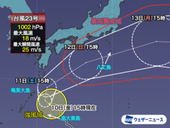 台風23号、速度が上がり軌道変更 【警戒】台風23号は3連休に影響か、台風22号で被害の伊豆諸島は再び警報級大雨の恐れ台風23号は、あす11日には沖縄本島や奄美に接近。12日には九州南部や四国に、三連休最終日の13日には本州南部や伊豆諸島に影響が出る見込み。強風、海のしけなどに注意が必要。 pic.twitter.com/w1qvu47k5O— ライブドアニュース (@livedoornews) October 9, 2025 【台風情報】台風23号(ナクリー)は明後日12日(日)、暴風域を伴って本州の南を東進し、西日本、東日本の太平洋沿岸では影響の出る可能性があります。夜には台風22号の被害が出たばかりの伊豆諸島南部に近づく見通しで、警戒が必要です。 pic.twitter.com/deJGxA4FOn— ウェザーニュース (@wni_jp) October 10, 2025…