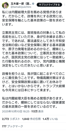国民民主党の玉木代表「私は内閣総理大臣を務める覚悟があります。だからこそ、政権を共にする政党には、安全保障を軸とした基本政策の一致を求めています。」