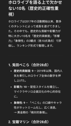 引用元: 308: Vtuberまとめ2025/10/10(金) 09:20:04.46 「ホロライブを語る上で欠かせない10名(歴史的正確性重視)」 Hololive Key MembersA conversational AI system that listens, learns, and challengeschatgpt.com さくらみこ→「派閥形成に大きく貢献」 ワロタ 312: Vtuberまとめ2025/10/10(金) 09:20:22.92 >>308 これほんと草 326: Vtuberまとめ2025/10/10(金) 09:22:10.82 >>308 こう見るとやっぱホロを作ったのはぺこマリココよなぺこら→ゲーム実況の先駆者。RPGで同接5万出した最初のVtuber マリン→企画で伸びた最初のVtuber。事故紹介card背信で同接5万 ココ→海外リスナーを持ってきてホロを拡大した最大の功労者 327: Vtuberまとめ2025/10/10(金) 09:22:15.10 >>308 がんばってAIを調教してそうなるように仕向けたんだねw 無駄な努力ご苦労さま AIの発言を誘導できるのはGPT使ってるやつならわかるだろ 337: Vtuberまとめ2025/10/10(金) 09:22:53.74 >>308 あ 338: Vtuberまとめ2025/10/10(金) 09:23:00.45 >>326 5年前にドラクエで同接5万はやっぱ凄いわ その頃RPGで同接5万出すやつなんか加藤純一ぐらいだったからな 347: Vtuberまとめ2025/10/10(金) 09:23:31.77 >>326 それを全て無に返す炎上 348: Vtuberまとめ2025/10/10(金) 09:23:32.78 >>326 スバルもかなたもぺこらのスタイル真似したからね 言わずもがなさくらみこもな 357: Vtuberまとめ2025/10/10(金) 09:24:04.53 >>348 真似したのどんなスタイル? 379: Vtuberまとめ2025/10/10(金) 09:25:27.69 >>326 あくあも功労者だろ 396: Vtuberまとめ2025/10/10(金) 09:26:39.25 >>326 改造ROM事件全て失ったぺっさん・・・ 462: Vtuberまとめ2025/10/10(金) 09:30:42.90 >>308 ブハハハハハハハハハハwwwwwwwwwブハーッハハハハハハハwwwwwwwww…