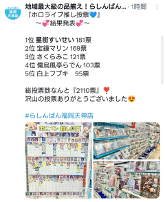 引用元: 442: Vtuberまとめ2025/10/11(土) 17:59:08.58 『ホロライブ推し投票💙』 ~💞結果発表💞~ 1位 星街すいせい 181票 2位 宝鐘マリン 169票 3位 さくらみこ 121票 4位 儒烏風亭らでん 103票 5位 白上フブキ 95票 458: Vtuberまとめ2025/10/11(土) 17:59:42.02 >>442 らでんつよ 465: Vtuberまとめ2025/10/11(土) 18:00:10.26 >>442 らでんつよ 471: Vtuberまとめ2025/10/11(土) 18:00:26.10 >>442 ぺっさんはNG? 472: Vtuberまとめ2025/10/11(土) 18:00:35.43 >>442 こよどこ~😭 482: Vtuberまとめ2025/10/11(土) 18:01:12.07 >>471 名前使えないから仕方ないね 489: Vtuberまとめ2025/10/11(土) 18:01:38.11 >>442 らでんの人気はマジで意味不明 520: Vtuberまとめ2025/10/11(土) 18:02:38.05 >>489 まあ福岡だから あそこの連中頭おかしいし 537: Vtuberまとめ2025/10/11(土) 18:03:31.58 >>489 小学生に大人気 629: Vtuberまとめ2025/10/11(土) 18:07:47.82 >>442 こよりどーすんのこれ 687: Vtuberまとめ2025/10/11(土) 18:10:09.31 >>629 なんでこより?なにかあった? 702: Vtuberまとめ2025/10/11(土) 18:11:00.71 >>687 こよりは人気があるはずなのにどうしてランクインしてないの? って事じゃねーの…