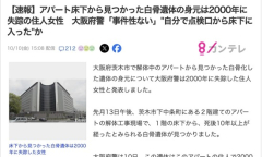 1 : 大阪府茨木市で解体中のアパートから見つかった白骨化した遺体の身元について大阪府警は2000年に失踪した住人女性と発表しました。 先月13日午後、茨木市下中条町にある2階建てのアパートの解体工事現場で、1階の床下から、死後10年以上が経ったとみられる白骨遺体が見つかりました。 大阪府警は10日、この遺体はこのアパートの住人で2000年から行方が分からなくなっていた女性であると発表しました。 失踪当時、女性は58歳で女性は遺書を残していたということです。 女性が自分で点検口から床下に入ったとみられ、警察は事件性はないとみています。 2 : 遺書まで書いたのに誰も気づかないとか 23 : >>2 いや。どこに居るとは書いてないだろうw…