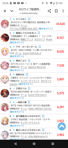 引用元: 218: Vtuberまとめ2025/10/11(土) 23:27:48.91 ちょっとまずいか…?🤔 226: Vtuberまとめ2025/10/11(土) 23:28:14.62 >>218 みこいなかったら終わってて草 228: Vtuberまとめ2025/10/11(土) 23:28:20.84 >>218 鷹嶺ルイ5万でるんじゃなかったの 231: Vtuberまとめ2025/10/11(土) 23:28:24.47 >>218 何が? 236: Vtuberまとめ2025/10/11(土) 23:28:27.73 >>218 やっぱホロ全体的に数字でなくなってない? 237: Vtuberまとめ2025/10/11(土) 23:28:28.98 >>218 ロベル以下クビで良くねえ 240: Vtuberまとめ2025/10/11(土) 23:28:34.33 >>218 みこち居なかったら土曜の夜なのに終わってるな 244: Vtuberまとめ2025/10/11(土) 23:28:42.30 >>218 1万切るのはちょっと… 245: Vtuberまとめ2025/10/11(土) 23:28:43.99 >>218 りりーかFFT飽きられてね? 246: Vtuberまとめ2025/10/11(土) 23:28:44.81 >>218 ロベル入れるな 258: Vtuberまとめ2025/10/11(土) 23:28:53.42 >>218 ホロライブの上位と下位の差とんでもないことになってんな 266: Vtuberまとめ2025/10/11(土) 23:29:03.44 >>236 ホロメンつまんないもん 279: Vtuberまとめ2025/10/11(土) 23:29:36.38 >>218 ロベル以下の存在価値無し MADTOWN行け 280: Vtuberまとめ2025/10/11(土) 23:29:37.18 >>218 リグロスこれで有明埋められるんだな 配信見てないファンしかいない 284: Vtuberまとめ2025/10/11(土) 23:29:50.83 >>218 あたし言ったよねカバー 新人伸ばさないと尾張だって 294: Vtuberまとめ2025/10/11(土) 23:30:16.14 >>284 そのために中身優秀なの取ってきたの😡 308: Vtuberまとめ2025/10/11(土) 23:30:48.42 >>218 アルランディスって知名度だけで数字無いんかよ 313: Vtuberまとめ2025/10/11(土) 23:31:01.92 >>284 伸ばしても尾張なんじゃ? 315: Vtuberまとめ2025/10/11(土) 23:31:09.03 >>218 MAD TOWN組強くて草 316: Vtuberまとめ2025/10/11(土) 23:31:10.37 >>245 こより見てるからもういいやってのがいるんじゃね 元からバフも弱いし 334: Vtuberまとめ2025/10/11(土) 23:32:02.46 >>218 ちょっと前までやってたラミイやフブみおも1万5千くらいだしな 冗談じゃなくみこ以外そんな出てない 338: Vtuberまとめ2025/10/11(土) 23:32:17.36 >>218 配信の義務感がキツくなってきた ちゃんとゲーム好きな個人見たほうがいい 342: Vtuberまとめ2025/10/11(土) 23:32:34.43 >>218 実際洒落にならないくらいヤバい 350: Vtuberまとめ2025/10/11(土) 23:32:56.86 >>218 力の集約だろ 431: Vtuberまとめ2025/10/11(土) 23:35:21.69 >>338 これはそう ぺこらもそうだがただやってるだけの奴見るより他見たほうがいいからな 473: Vtuberまとめ2025/10/11(土) 23:36:33.35 >>218 そりゃいろいろと不穏な情報漏れ出てるしな 502: Vtuberまとめ2025/10/11(土) 23:37:21.71 >>218 箱推しマジで減ったな 534: Vtuberまとめ2025/10/11(土) 23:38:37.18 >>218 よし!一般化に成功したな! 574: Vtuberまとめ2025/10/11(土) 23:40:12.11 >>218 なんか名前ばっか有名なゲームばっかりやってて インディーとかのおもろそうなゲームはあんまやらないんだよな 586: Vtuberまとめ2025/10/11(土) 23:40:32.80 >>502 箱推しならみこち優先するのが当たり前 600: Vtuberまとめ2025/10/11(土) 23:40:58.01 >>574 でもお前ら嫌いじゃん 620: Vtuberまとめ2025/10/11(土) 23:41:51.19 >>574 その点ぺこらって凄いよな 635: Vtuberまとめ2025/10/11(土) 23:42:14.33 >>218 箱としてはもうオワコンやな 677: Vtuberまとめ2025/10/11(土) 23:43:49.83 >>218 さくらみこが出過ぎなだけで他がvとして普通だぞ 683: Vtuberまとめ2025/10/11(土) 23:44:00.90 >>677 そうなの? 715: Vtuberまとめ2025/10/11(土) 23:45:05.98 >>683 同接1000人超えたら十分や 826: Vtuberまとめ2025/10/11(土) 23:48:34.36 >>218 ホロ甲は箱企画だから同接集中するのはしゃあない まぁそのホロ甲をみこちがやってるのに4万しかでてないのがヤバいんだけども 882: Vtuberまとめ2025/10/11(土) 23:50:10.48 >>826 期間長いのとその上を行くスト界隈全体箱企画GTAあるからな…