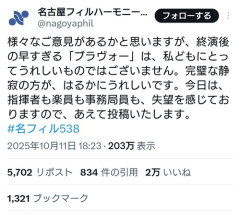 1: 2025/10/11(土) 22:50:52.906 ガチでテロやん 様々なご意見があるかと思いますが、終演後の早すぎる「ブラヴォー」は、私どもにとってうれしいものではございません。完璧な静寂の方が、はるかにうれしいです。今日は、指揮者も楽員も事務局員も、失望を感じておりますので、あえて投稿いたします。#名フィル538— 名古屋フィルハーモニー交響楽団 (@nagoyaphil) October 11, 2025 ※関連記事 【衝撃】日本人がクラシックを楽しむ方法、やっと見つかる……