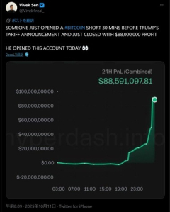 624: 名無し 2025/10/11(土) 15:04:12.57 ID:oac0gqZu0 トランプが関税を発表する30分前にビットコインを大きくショートして8800万ドル(約133億円)儲けたアカウントあり。そして、そのアカウントは今日開設。春からトランプ関税でインサイダー取引がばんばん行われているが、政権関係者のためかお咎め一切なし。 SOMEONE JUST OPENED A #BITCOIN SHORT 30 MINS BEFORE TRUMP'S TARIFF ANNOUNCEMENT AND JUST CLOSED WITH $88,000,000 PROFIT HE OPENED THIS ACCOUNT TODAY 👀…