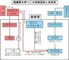 1 名前:おっさん友の会 ★:2025/10/12(日) 10:17:41.76 ID:jHz5qjsK9.net Yahooニュース 遠藤誉中国問題グローバル研究所所長、筑波大学名誉教授、理学博士 10/11(土) 21:16 やっと自公連立が解消した。万歳と言いたい。 これで数合わせのための異常な政治体制が正常に戻る。理念がまったく異なる自公連立がどれだけ日本の政治を歪め、日本経済を蝕んできたことか。失われた30年は自公連立時代と重なると言っても過言ではない。 自民党は長きにわたって、「創価学会」と「統一教会」という二つの宗教団体を利用して「票集め」にのみ狂奔し、政策理念を犠牲にして日本国民を置き去りにしてきた。日本は悲鳴を上げ、限界に達している。 それに終止符を打ってくれたのだから、「高市総裁」は初めて良いことをしてくれたと言っていいだろう。 高市氏が靖国参拝問題に関して譲歩したあとは、公明党は「自民が政治と金問題に対して徹底した改革を行わないから」を最大の連立解消問題とした。 (中略) ◆組織票欲しさに二大宗教団体を利用してきた自民党と、その旨みを享受してきた宗教団体 今さら言うまでもないが、旧統一教会が自民党に食い込んできたのは1960年代のことだ。 韓国で生まれた旧統一教会は1968年に反共政治団体「国際勝共連合」を韓国と日本で創設し、当時の岸信介首相と意気投合した。岸氏は安倍元首相の祖父なので、安倍氏が旧統一教会にのめり込んでいったのもうなずける。 岸氏も安倍氏も「組織票欲しさ」からの動機だが、旧統一教会の場合は「勝共」という理念が一致していたので、「政治とカネ」の問題は深く巣食っていたものの、政策実現へのダメージは,それほど大きくはない。 旧統一教会が「世界平和統一家庭連合」と改名してから、自民党に「子ども家庭庁」などが新設されてことくらいだろうか。 しかし裏金問題は深刻で、今も完全に解決されたとは言いにくい。 方や公明党の場合は、10月8日のコラム<靖国参拝で公明党に譲歩した高市総裁 結局は中国のコントロール下になり続ける道を選んだ自民党>に書いたように、圧倒的に 「中国共産党」をバックボーンとして活動しており、その母体は「創価学会」という宗教団体である。公明党が自民党と連立を組み始めたのは1999年なので、旧統一教会と比べると歴史は浅い。 この二つの宗教団体がどのようにして自民党に食い込んできたかを示したのが図表1である。 図表1の青色部分は旧統一教会で、「反共と組織票集め」により自民党の中に食い込んだ。 この災禍は「政治とカネ」の問題として日本を揺るがしたことはあまりに有名なので、ここではくり返さない。 図表1の赤色部分は宗教団体・創価学会が母体となっている公明党の自民党内での動きだ。 理念的受け皿は自民党内の「左寄りの議員」たちのはずだが、公明党の組織票なしには当選できない自民党議員が多くなってきたので、右も左もなく公明党を支持するようになった。 左右の区別なく「個人的つながり」として自民党と公明党を結び付けた議員の中には、現存では菅元総理などがいる。 菅氏は総裁選のときには小泉候補を支援していたので、「個人的つながり」として小泉氏は公明党と繋がっているが、麻生氏の策略により小泉氏は落選し高市氏が総裁に当選した。 この時点で、すでに公明党としては自民党に距離感を持っただろうが、最悪だったのは、自民党執行部人事で、高市氏はすべて麻生氏の言いなりになってしまったことだ。 もちろん高市氏には自民党内における派閥のような基盤がないので、麻生氏が後ろ盾になってくれるなら心強いという側面はあっただろう。 それは仕方ないとしても、問題は麻生氏が「物凄く公明党が嫌い」というところにあった。その決定打となったのが萩生田光一氏を自民党幹事長代行に起用したことである。 萩生田氏は、高市氏の言葉を借りれば裏金問題での「傷もの」。 旧統一教会との関係が深く、公明党としてはその問題はまだ解決してないと位置付けている。 つまり二つの宗教団体のパワー・バランスにおいて、「創価学会」からすればライバル関係にあった「旧統一教会」の「残滓」を党執行部に起用したということは、何にもまして許しがたいことだったにちがいない。 だから、この事実を「政治とカネ」問題という言葉で象徴的に代表させたものと推測される。 引用元:…