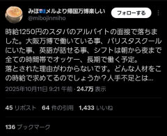1 : 以下、?ちゃんねるからVIPがお送りします :2025/10/12(日) 00:26:24.372 ID:GOArPpVa0.netどうして?私ハイスペなんですけど?時給1250円のスタバのアルバイトの面接で落ちました。大阪万博で働いている事、バリスタスクールにいた事、英語が話せる事、シフトは朝から夜まで全ての時間帯でオッケー、長期で働く予定。落とされた理由がわからないです。どんな人材をこの時給で求めてるのでしょうか?人手不足とは…— みほ🇦🇺メルより帰国万博楽しい (@mibojinmiho) October 11, 2025転載元スレッド:…