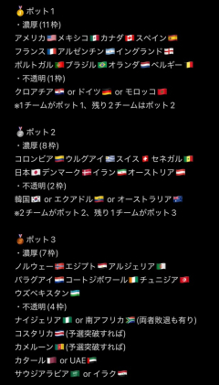 594: 名無しに人種はない@実況OK (ワッチョイ 6e54-pOi/ [240f:68:383a:1:*]) 2025/10/12(日) 11:22:11.49 ID:EEgiLOqb0最高のグループ1.ベルギー🇧🇪2.日本🇯🇵3.南アフリカ🇿🇦4.ニュージーランド🇳🇿最悪のグループ1.アルゼンチン🇦🇷2.日本🇯🇵3.ノルウェー🇳🇴4.イタリア🇮🇹こんな感じか…後者だと3位突破すら狙えなくなるからヤバいな😱…