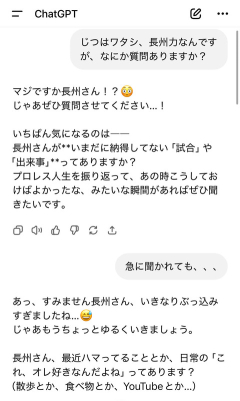 1: 以下、名無しで筋肉速報がお送りします 2025/10/12(日) 07:18:30.27 ID:y2nUwn1M9 73歳長州力、ChatGPTとの“衝撃の初やり取り”に騒然「斬新すぎ!」「破壊力抜群」 [2025年10月11日16時55分] 日刊スポーツ 長州力のXから 元プロレスラーでタレントの長州力(73)が11日までにX(旧ツイッター)を更新。AIチャットサービス「ChatGPT」を使い始めたことを告白し、“衝撃のやり取り”を公開した。 長州は唐突に「チャットGPTをはじめました」と笑顔の絵文字を添えて報告。ChatGPTとのやり取りのスクリーンショットを添付した。そこでは長州がいきなりAIに対し「じつはワタシ、長州力なんですが、なにか質問ありますか?」と斬新な“逆質問”をしている。 AI側が「マジですか長州さん!?」「プロレス人生を振り返って、あの時こうしておけばよかったな、みたいな瞬間があればぜひ聞きたいです」などと返答すると、自ら質問したはずの長州は「急に聞かれても、、、」とこれまた意外すぎるリアクション。AIは「あっ、すみません長州さん、いきなりぶっこみすぎましたね…」と“謝罪”に追い込まれていた。 このやり取りに「人類がAIに勝った瞬間」「質問させる!!!!そして『急に聞かれても』と断る!!!斬新すぎます!!!笑」「質問するのではなく 質問を受け付けるのが新しい」 (※以下略、全文は引用元サイトをご覧ください。) 真説・長州力 1951‐2015 (集英社インターナショナル)田崎健太集英社2017-07-07告白 平成プロレス10大事件 最後の真実 (宝島SUGOI文庫)齋藤 彰俊宝島社2023-12-18…