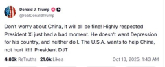 398: 名無し 2025/10/13(月) 02:32:12.84 ID:q1UovP6A0 中国のことは心配しないで、きっと大丈夫!尊敬されている習近平国家主席は、今まさに最悪の状況に陥った。彼は自国が不況に陥ることを望んでいない。私も同じだ。アメリカは中国を助けたいのであって、傷つけたいのではない!DJT大統領…