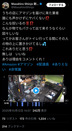 1: 2025/10/13(月) 09:22:32.33 うちの店にアマゾンを届けに来た業者誰にも声かけずにヤバくない⁉️こんな奴いるの‼️⁉️なんか物でもパクって出て来そうなぐらい図々しいなってかお客さんがトイレ行ってる間にその人の物の上に置きかけてるし💦これありだと思う⁉️無しは いいねありは理由をコメントくれ!#Amazon #アマゾン… pic.twitter.com/q0gw721RmB— Masahiro Shinjo 新庄雅浩 (@MasahiroShinjo) October 12, 2025 ※関連記事 【画像】女さん「Amazon配達員、頭おかしいのかな?置き配拒否してるのにこのザマ(笑)」→配達員ブチ切れ大炎上…