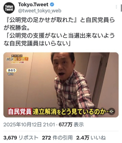 1:エクスプロイダー(和歌山県) [ID]:2025/10/13(月) 10:33:52.95 ID:+MLp3qwa0 BE:662593167-2BP(2000) 『公明党の足かせが取れた』と自民党員らが祝勝会。「公明党の支援がないと当選出来ないような自民党議員はいらない」 pic.twitter.com/6aeNCidbWq— Tokyo.Tweet (@tweet_tokyo_web) October 12, 2025 2:エクスプロイダー(和歌山県) [ID]:2025/10/13(月) 10:34:05.73 ID:+MLp3qwa0 BE:662593167-2BP(1000) …1080/Km7vyL1sZaNvVFww.mp4 36:急所攻撃(新日本) [IL]:2025/10/13(月) 10:49:23.58 ID:EPxA3BYl0 >>2 自民党員からしたら自民党以外の人が入ってきて政策になんだかんだいうのは気分良くないんじゃないの?とずっと思ってたんだけどやっぱりそうだよな。 172:ダイビングフットスタンプ(岐阜県) [FR]:2025/10/13(月) 13:31:05.96 ID:PLv+Q1Zu0 >>2 根っからの高市信者みたいな自民党員やないかい…