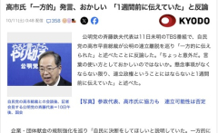 1 : 公明党の斉藤鉄夫代表は11日未明のTBS番組で、自民党の高市早苗総裁が公明の連立離脱を巡り「一方的に伝えられた」と述べたことに反論した。「ちょっと意外だ。言葉の使い方としておかしいのではないか。懸念事項がなくならない限り、連立政権ということにはならないと1週間前に伝えていた」と述べた。 企業・団体献金の規制強化を巡り「自民に決断をしてほしいと説明していた。一方的に突然というのは少し違うのではないか」とも語った。 3 : こんなのが習近平やトランプとやりとりできるとは到底思えないけど?🤔 4 : 公明党は嘘つき…