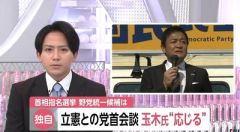 1: 名無し 2025/10/13(月) 14:19:22.47 ID:m7RfT2sPwK (1/1回レス) [] [-] 国民民主党の玉木雄一郎代表が13日、FNNの単独取材に応じ、立憲民主党の野田佳彦代表から呼びかけられている党首会談について「いつでも会いたい」と述べ、応じる意向を示した。 ただし、首相指名選挙での協力については「基本政策の一致が前提」と強調。 玉木氏は「安全保障やエネルギー政策で一致できなければ、連立や政権合意はあり得ない」とも語った。 一方、野田代表は「野党連携の第一歩にしたい」と意欲を見せており、今後の会談が野党再編の起点となる可能性がある。 ■要約 国民民主・玉木代表が、立憲の野田代表からの党首会談要請に「いつでも会いたい」と応じる姿勢を示した。 ただし、首相指名選挙での協力には「基本政策の一致」が必要とし、安全保障やエネルギー政策での立場の違いを指摘。 立憲は野党共闘再構築を目指すが、玉木氏は「安保法制を否定する勢力とは組めない」との姿勢を崩していない。 会談の実現次第で、野党勢力の再編機運に影響を与える可能性がある。 ■解説 玉木氏の発言は、野党再編に向けた“距離の取り方”を明確にしたものだ。 立憲が掲げる安保法制見直しや再エネ偏重政策とは一線を画し、現実的な保守中道を打ち出す国民民主の立場を示している。 公明党が離脱し政界が流動化する中で、玉木氏は「政権の担い手」を意識した発信を強めており、 単なる野党共闘ではなく“政策連立”の形を模索しているとみられる。 いまの日本政治に求められるのは、理念よりも実効性を重んじる路線形成だといえる。 出典:FNNプライムオンライン(Yahoo!ニュース) 公明党・斉藤鉄夫代表、企業献金規制「自民党も含めて合意を」 【悲報】 公明党斉藤鉄夫代表、連立離脱告げた時の高市早苗氏のリアクション →こういうことだった。 【ヒェッ】 仮想通貨、超絶大暴落で阿鼻叫喚の地獄絵図へwwww…