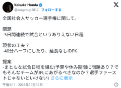 38: 名無し@サカサカ10 2025/10/13(月) 12:08:30.17 ケイスケホンダの提言で全社は変わるかね 宮本は本田ガン無視って訳じゃないけど 全国社会人サッカー選手権に関して。問題-5日間連続で試合というありえない日程現状の工夫?-40分ハーフにしたり、延長なしのPK提案-まともな試合日程を組む(予算や休み期間に問題あり?でもそんなチームがJFLにあがるべきなのか?選手ファーストじゃないといけない)…— Keisuke Honda (@kskgroup2017) October 12, 2025…