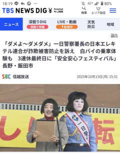 1 : 「ダメよ~ダメダメ」一日警察署長の日本エレキテル連合が詐欺被害防止を訴え 白バイの乗車体験も 3連休最終日に「安全安心フェスティバル」長野・飯田市 | SBC NEWS | 長野のニュース | SBC信越放送 ダメよーダメダメで大人気や!! 2 : なっつ 3 : なつ 4 : ガンよくなったん?…