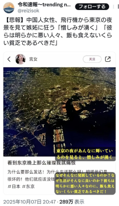 中国人女性、飛行機から東京の夜景を見て嫉妬に狂う「彼らは明らかに悪い人々、貧乏であるべきだ」