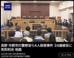 280: 名無し 2025/10/14(火) 14:10:27.25 ID:lqmRE7b/ 【NHKニュース速報】 長野・中野市の警察官ら4人殺害事件 34歳の被告に死刑判決 長野地裁(14:09)…