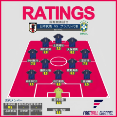 1: 名無し@サカサカ10 2025/10/14(火) 22:20:32.03 サッカー日本代表は14日、キリンチャレンジカップ2025(国際親善試合)でブラジル代表と対戦し3-2で勝利。この試合で、森保ジャパンのパフォーマンスはどうだったのだろうか。パラグアイ戦に出場した選手(出場時間の短い選手は除く)、監督のパフォーマンスをどこよりも早く採点する。 【日本 3-2 ブラジル キリンチャレンジカップ2025】 鈴木彩艶 6.5 2失点は仕方ない。後半には高精度フィードで東京スタジアムを沸かせた 渡辺剛 7.5 マルティネッリ、ロドリゴ相手に奮闘。彼の踏ん張りがなければどうなっていたか 谷口彰悟 6.0 前半はかなり厳しい戦いを強いられたが、後半はうまく立て直した 鈴木淳之介 7.5 ブラジル相手にも堂々たるパフォーマンス。左CBのレギュラーは確定か!? 堂安律 7.5 攻撃時は果敢な仕掛けが効いた。守備での貢献度も相変わらず高かった 佐野海舟 6.5 鎌田大地との関係性は素晴らしい。粘り強く相手にくらいついていた 鎌田大地 8.0 攻守において気の利いたプレーを連発。常に頭を使い中盤に安定感をもたらした 中村敬斗 7.5 値千金の同点ゴール! ドリブルの仕掛けも良く、強烈な存在感を放った 久保建英 6.5 堂安律とのコンビネーションが良かったが、ややボールを持ちすぎる場面も 南野拓実 7.0 相手のミスを見逃さず1点を奪う。これでチームに勢いをもたらした 上田綺世 7.5 最前線でよく体を張った。逆転ゴールのヘディングは驚異的だった 伊東純也 8.5 ジョーカーとして申し分ない活躍。高精度クロスが刺さりまくった 田中碧 – 出場時間短く採点不可 町野修斗 – 出場時間短く採点不可 相馬勇紀 – 出場時間短く採点不可 小川航基 – 出場時間短く採点不可 望月ヘンリー海輝 – 出場時間短く採点不可 森保一監督 6.5 前半はかなり苦しかったが、HTを経て修正。歴史的な勝利を収めた…
