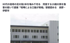 1 : そうはならんやろ… 2 : 80代の祖母の足の指2本を噛み千切る 同居する19歳の孫を傷害の疑いで逮捕「喧嘩による口論が発端」容疑認める 長野・伊那市 伊那市で、同居する祖母の足や腕に噛みつき、指を嚙み千切るなどしたとして、19歳の孫が13日未明、緊急逮捕されました。 傷害の疑いで逮捕されたのは、伊那市に住む19歳の無職の男です。 伊那警察署の調べによりますと、男は、12日の午後10時半ごろ、伊那市内の自宅で、同居する80代の祖母の左足と、左腕に噛みつき、足の中指と薬指を噛み千切って大けがをさせたほか、肘の付近に噛み傷などを負わせた疑いです。全文はソースで 3 : おばあちゃんと喧嘩して暴力振るうって考えられんわ 10 : 狂犬病だろなあ…