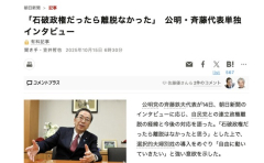 1 : 公明党の斉藤鉄夫代表が14日、朝日新聞のインタビューに応じ、自民党との連立政権離脱の経緯と今後の対応を語った。「石破政権だったら離脱はなかったと思う」とした上で、選択的夫婦別姓の導入をめぐり「自由に動いていきたい」と強い意欲を示した。 ――自民の高市早苗総裁は10日の斉藤氏との会談後、「一方的に離脱を伝えられた」と述べた。 一方的には伝えていない。(高市氏が総裁に就任した)4日から「政策協議が調わなければ離脱」と申し上げ、7日の1時間半の協議でも「政治とカネ」の問題をめぐり了解するための明確な線を伝えた。10日が最後だと前もって言ってはいなかったが、それでもこの問題に対する具体的な提案は高市氏から何もなかった。全文はソースで 2 : 中国共産党の犬が炙り出される 6 : 高市「総裁が自分じゃなかったら離脱しなかったのか」 斉藤「誰でも一緒(離脱した)」 斉藤鉄夫は病的なウソつき…