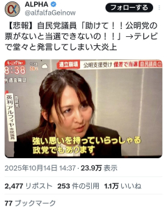 【悲報】自民党議員「助けて!公明党の票がないと当選できないの!」→テレビで堂々と発言
