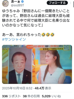 1: 名無しさん@ 2025/10/16(木) 10:51:07.51 ID:/zmTIWA+0● BE:662593167-2BP(2000) 3: 名無しさん@ 2025/10/16(木) 10:52:01.37 ID:RTLpz1Za0 のだなのだ 9: 名無しさん@ 2025/10/16(木) 10:55:22.94 ID:E8Hwwmly0 1回やったからもう良いのだ 14: 名無しさん@ 2025/10/16(木) 10:57:56.55 ID:2T6+JAyk0 ゆうちゃみ好き 83: 名無しさん@ 2025/10/16(木) 11:54:15.26 ID:lRYXbiG60 >>14 わかる 38: 名無しさん@ 2025/10/16(木) 11:10:03.01 ID:SLlAcZbe0 そりゃ石破と何も変わらんからな 94: 名無しさん@ 2025/10/16(木) 12:06:59.53 ID:Oa7AFZJo0 これは綺麗な一本!!!www 120: 名無しさん@ 2025/10/16(木) 12:46:55.17 ID:VtE53HzV0 2回やるのは難しいよ 引用元…