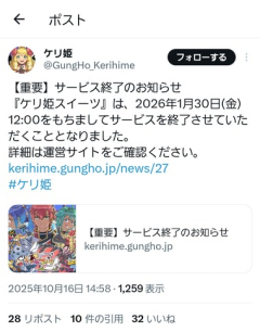 ガンホー、スマホゲーム「ケリ姫ツイーツ」を2026年1月30日にサービス終了 13年の歴史に幕