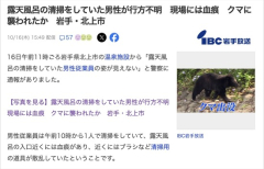 【岩手】露天風呂の清掃をしていた男性が行方不明 現場には血痕 クマに襲われたか