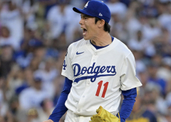 1: それでも動く名無し 2025/10/17(金) 19:33:35.25 ID:QHs1JH7b0ドジャース・佐々木朗希投手は16日(日本時間17日)、本拠地で行われたブルワーズとのリーグ優勝決定シリーズ第3戦に9回から救援登板。1回無安打無失点で今ポストシーズン3セーブ目を挙げた。中でも話題を呼んだのが、“物理法則無視”の1球だった。佐々木は2点リードの9回からマウンドへ。先頭のボーンに初球から99.7マイル(約160.5キロ)を計測。三遊間のゴロを遊撃手ベッツが捌き、華麗なジャンピングスローで1アウト目を記録した。続くフリリックは遊飛、最後はダービンを落差の大きいスプリットで空振り三振に仕留めて試合を締めた。…