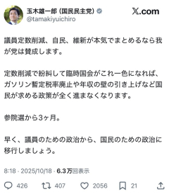 転載元: それでも動く名無し 2025/10/18(土) 08:51:24.79 ID:Kz6r/ZXC0 ※議員定数削減、自民、維新が本気でまとめるなら我が党は賛成します。定数削減で紛糾して臨時国会がこれ一色になれば、ガソリン暫定税率廃止や年収の壁の引き上げなど国民が求める政策が全く進まなくなります。参院選から3ヶ月。早く、議員のための政治から、国民のための政治に移行しましょう。— 玉木雄一郎(国民民主党) (@tamakiyuichiro) October 17, 2025 2: それでも動く名無し 2025/10/18(土) 08:52:55.26 ID:ooqUoIqh0 最後の一文、どの口が感がすごい…