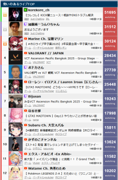 引用元: 322: Vtuberまとめ2025/10/18(土) 00:13:33.25 あっこりゃあああ 334: Vtuberまとめ2025/10/18(土) 00:14:47.94 >>322 この時間は男が強いな 338: Vtuberまとめ2025/10/18(土) 00:15:02.88 >>322 W同時視聴がホロ2位なの草 343: Vtuberまとめ2025/10/18(土) 00:15:18.03 >>322 ホロライブのゴールデンタイムは18〜23時までだもんな 短いから何とかしないと 348: Vtuberまとめ2025/10/18(土) 00:15:34.94 >>322 金曜デバフ 355: Vtuberまとめ2025/10/18(土) 00:16:08.82 >>322 船長が一位じゃないだと 357: Vtuberまとめ2025/10/18(土) 00:16:22.60 >>322 金曜はデバフだわな 365: Vtuberまとめ2025/10/18(土) 00:16:52.55 >>322 せめてAM1時くらいまではホロライブが勝ってて欲しかった 368: Vtuberまとめ2025/10/18(土) 00:17:13.83 >>322 コレコレ人減ったな 前は6万くらいいたのに 374: Vtuberまとめ2025/10/18(土) 00:17:35.88 >>322 ホロメンは忙しいから夜は寝てるんだよ…