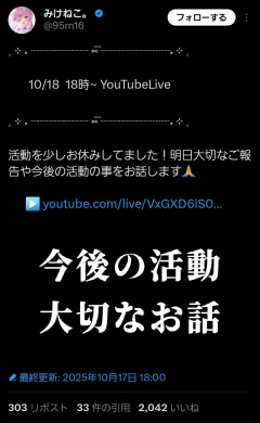 引用元: 32: Vtuberまとめ2025/10/18(土) 01:36:32.70 大切なお知らせ来るぞ! 45: Vtuberまとめ2025/10/18(土) 01:37:03.25 >>32 実写化か? 49: Vtuberまとめ2025/10/18(土) 01:37:10.48 >>32 大型開示でもするのか 59: Vtuberまとめ2025/10/18(土) 01:37:27.42 >>32 卒業か 68: Vtuberまとめ2025/10/18(土) 01:37:38.98 >>32 おかえり 72: Vtuberまとめ2025/10/18(土) 01:38:00.88 >>32 るしあ復活 86: Vtuberまとめ2025/10/18(土) 01:38:40.40 >>32 箱やめたばっかじゃん 90: Vtuberまとめ2025/10/18(土) 01:38:46.67 >>32 どうせアンチ開示しますとかだろ 94: Vtuberまとめ2025/10/18(土) 01:38:53.89 >>32 政界進出か 112: Vtuberまとめ2025/10/18(土) 01:39:35.54 >>32 今暇だから今からやってほしい 134: Vtuberまとめ2025/10/18(土) 01:40:49.45 >>112 自分勝手で草 312: Vtuberまとめ2025/10/18(土) 01:47:56.95 >>32 また別の事務所に入るんじゃね…